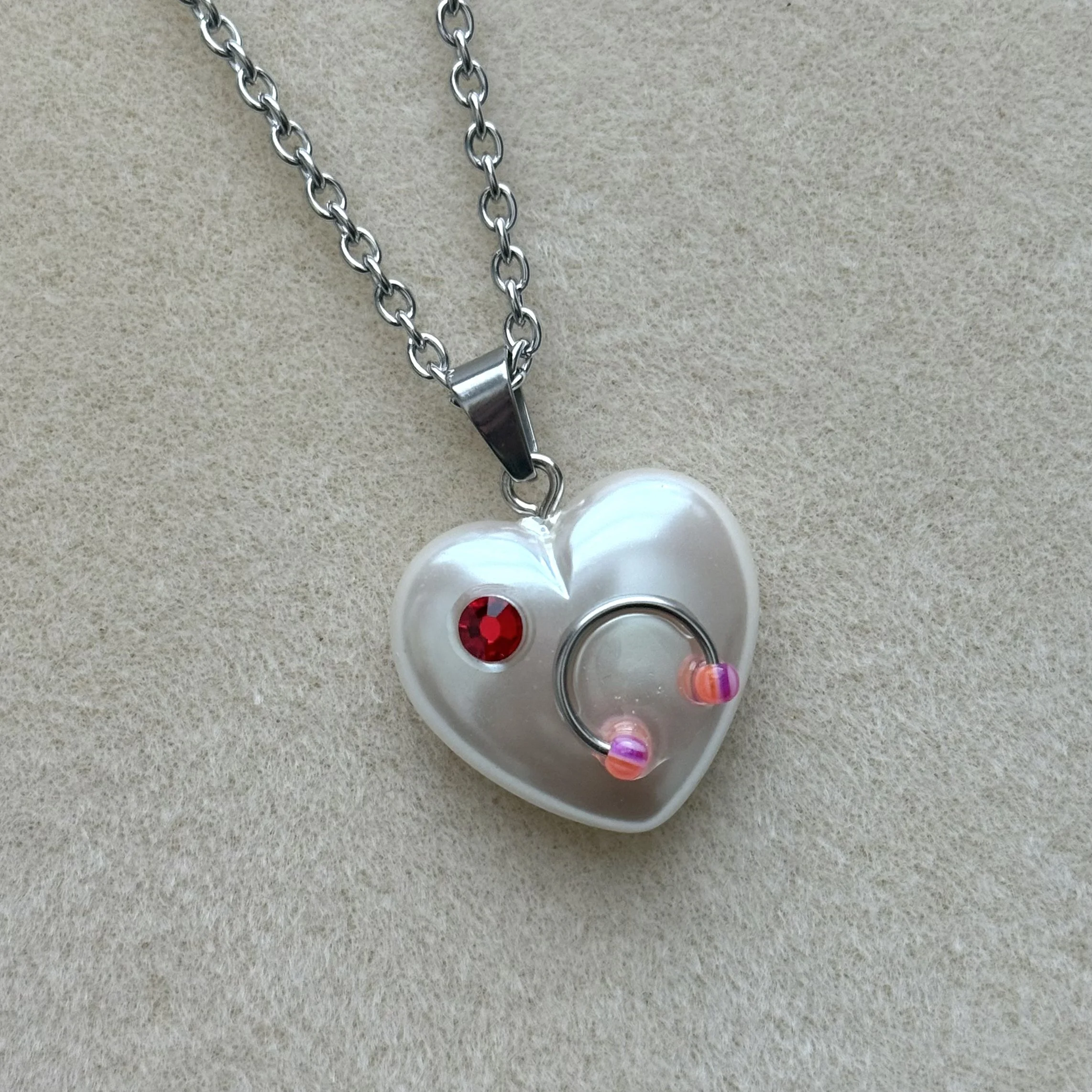 an upcycled faux pearl heart pendant adorned with a horseshoe piercing and crystal rhinestone on stainless steel hardware! all pieces can be delicate so handle with care!