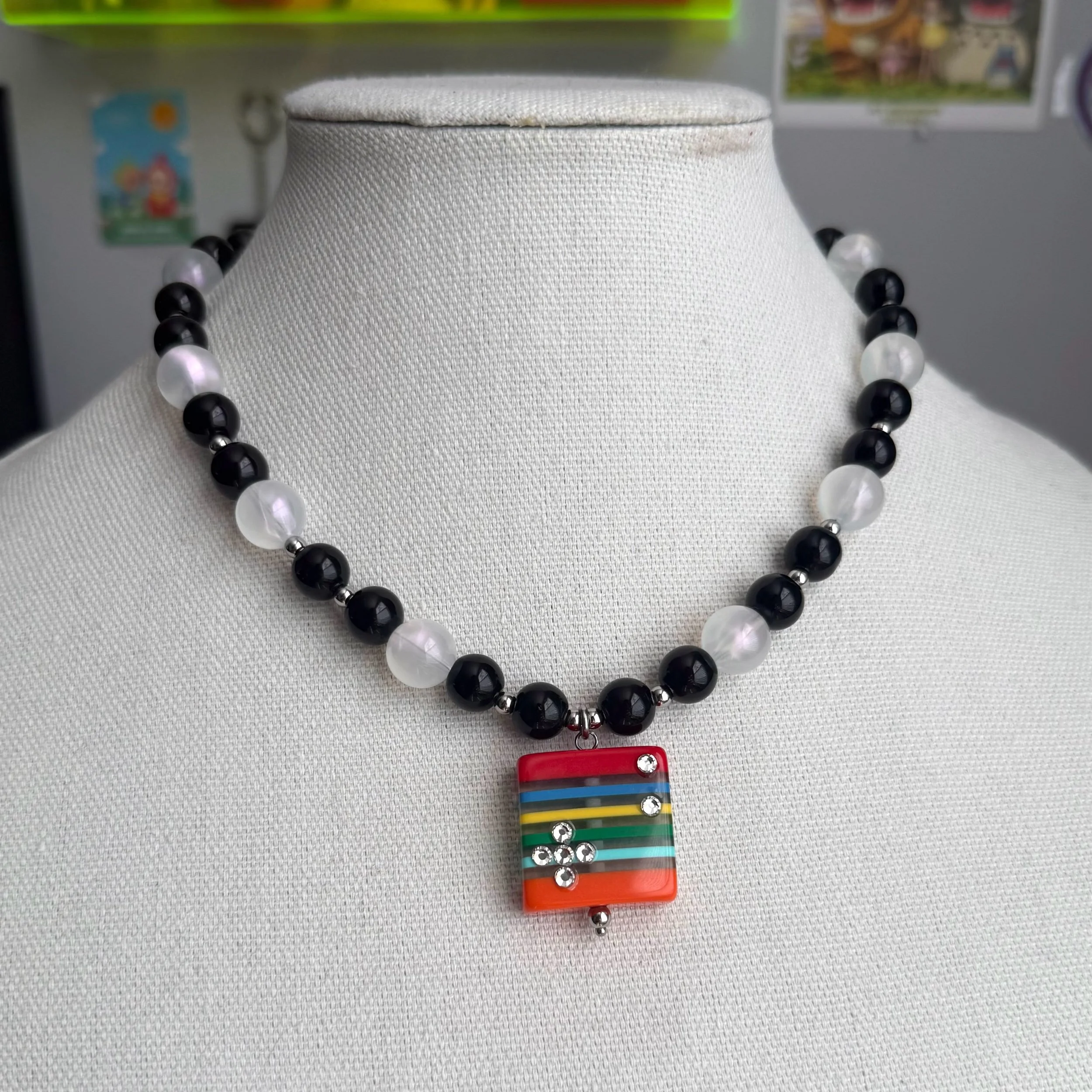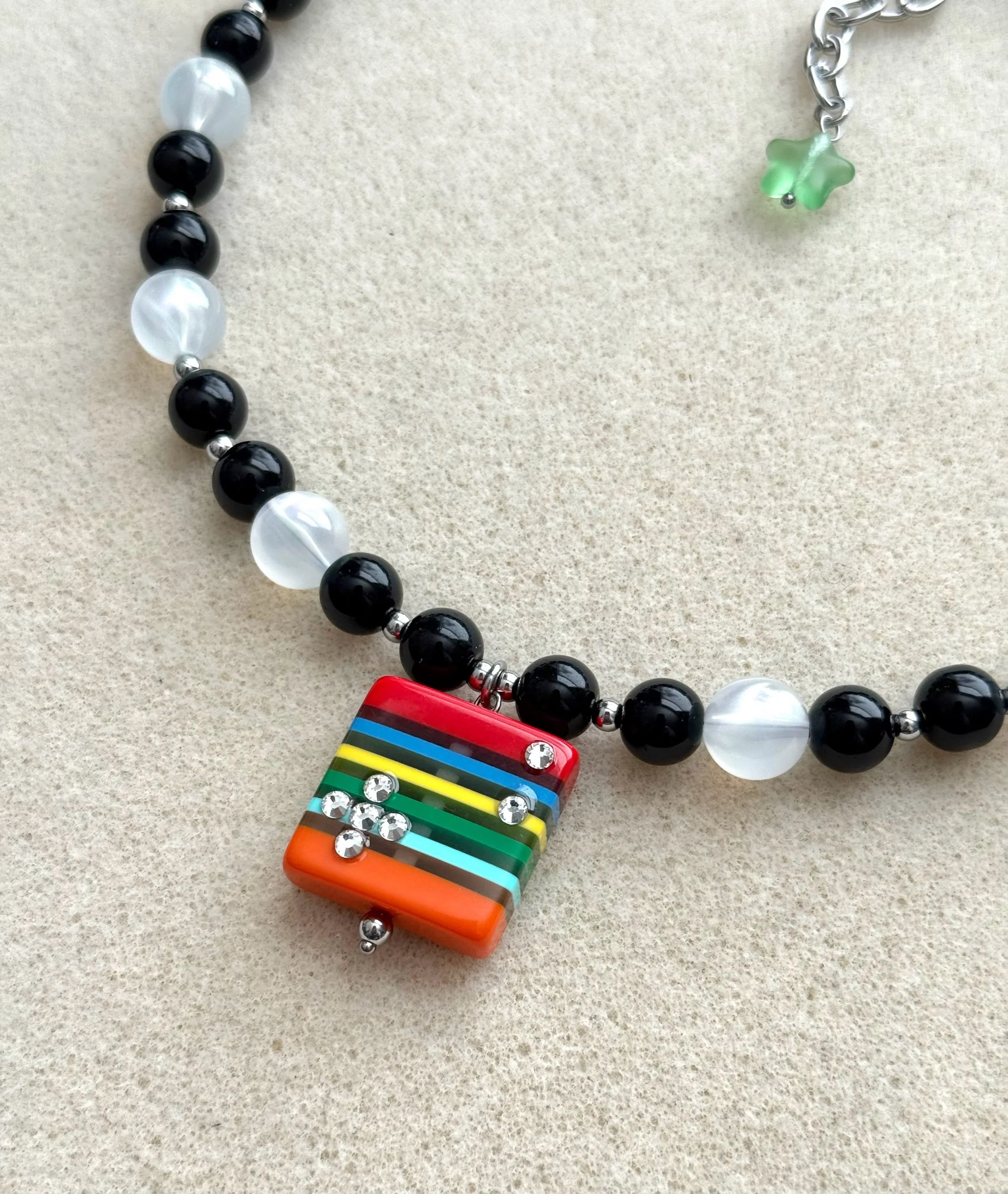 made with vintage lucite beads, stainless steel beads + hardware, a czech glass star, and an upcycled acrylic rainbow tile bead with rhinestones sealed in uv resin! all pieces can be delicate so handle with care!