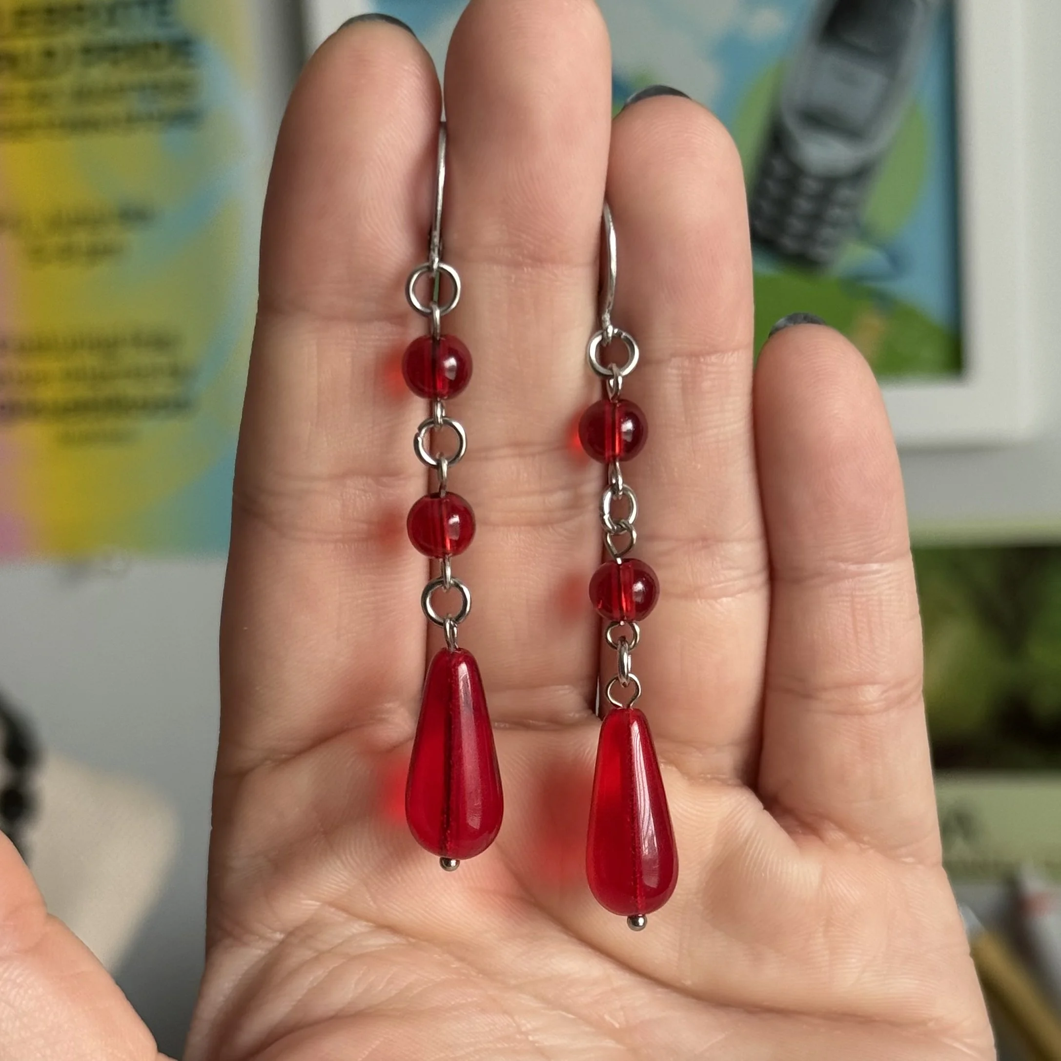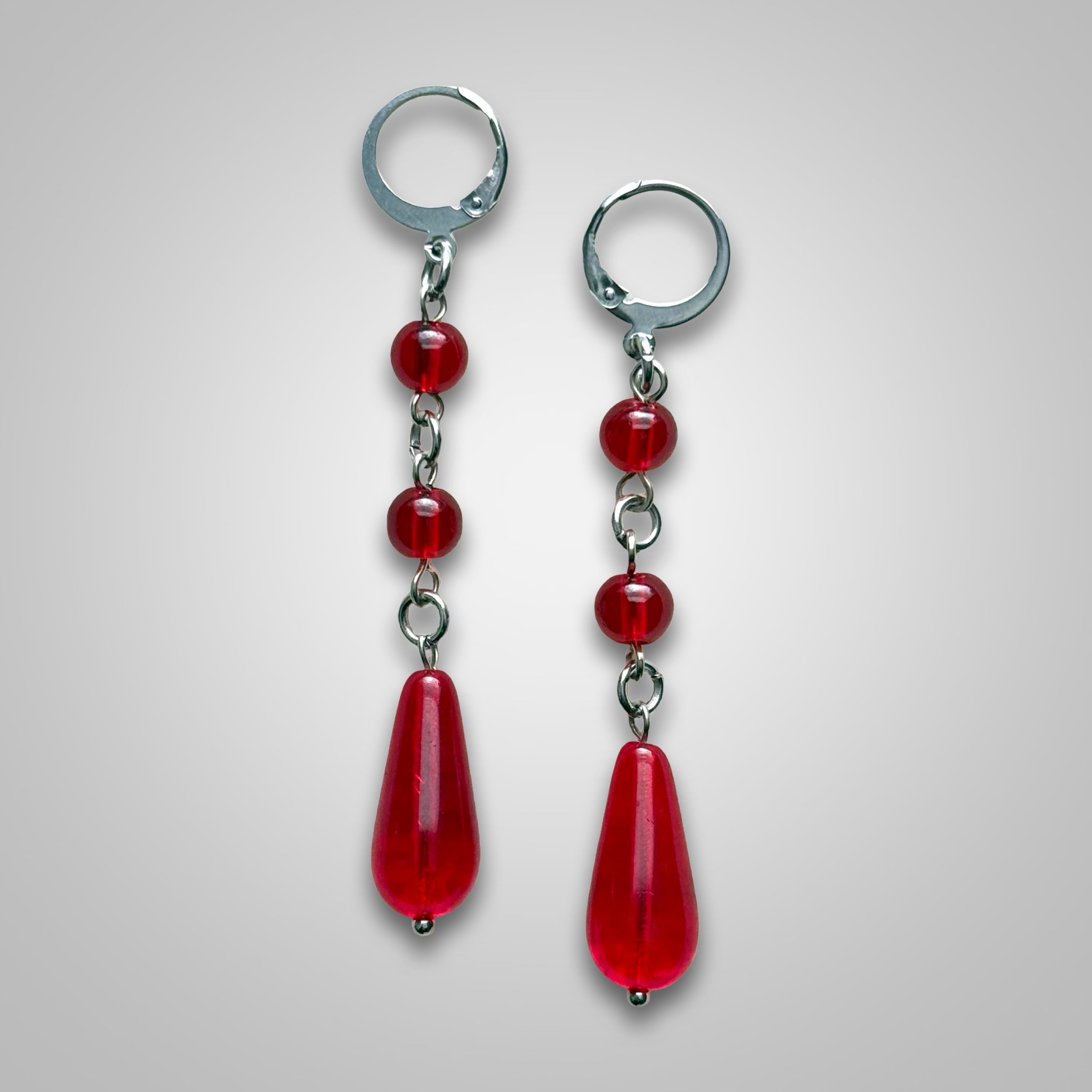 made with red glass beads and stainless steel lever back hoops + hardware! all earrings are hypoallergenic and perfect for any skin allergies! all pieces can be delicate so handle with care!
