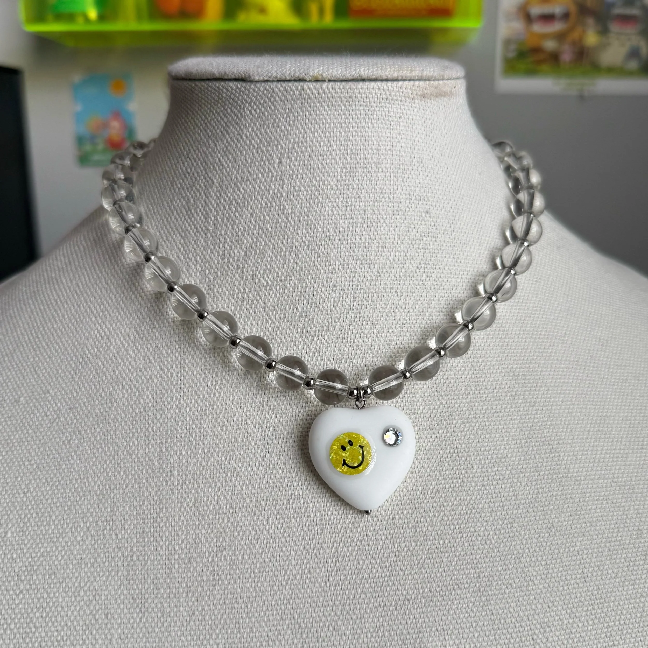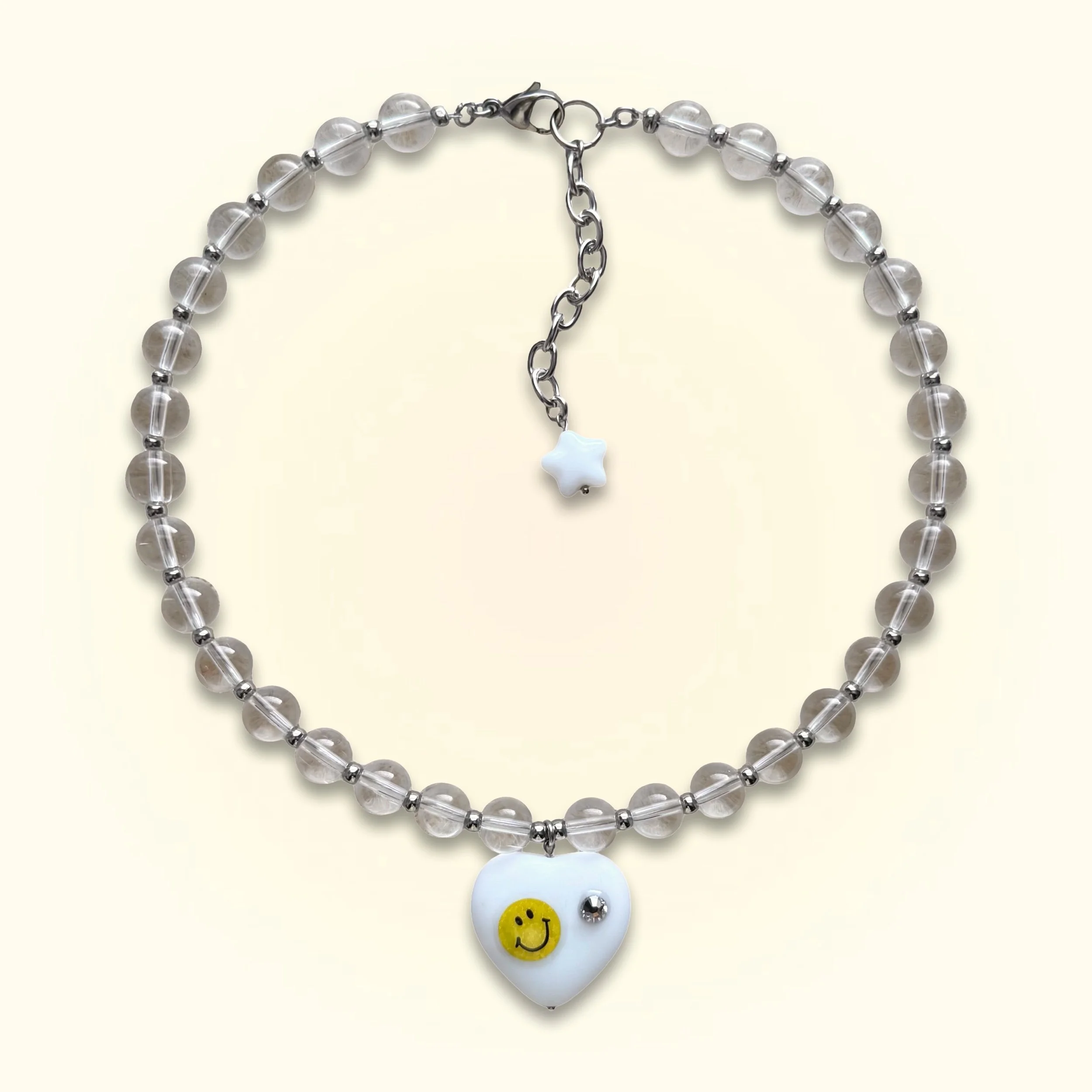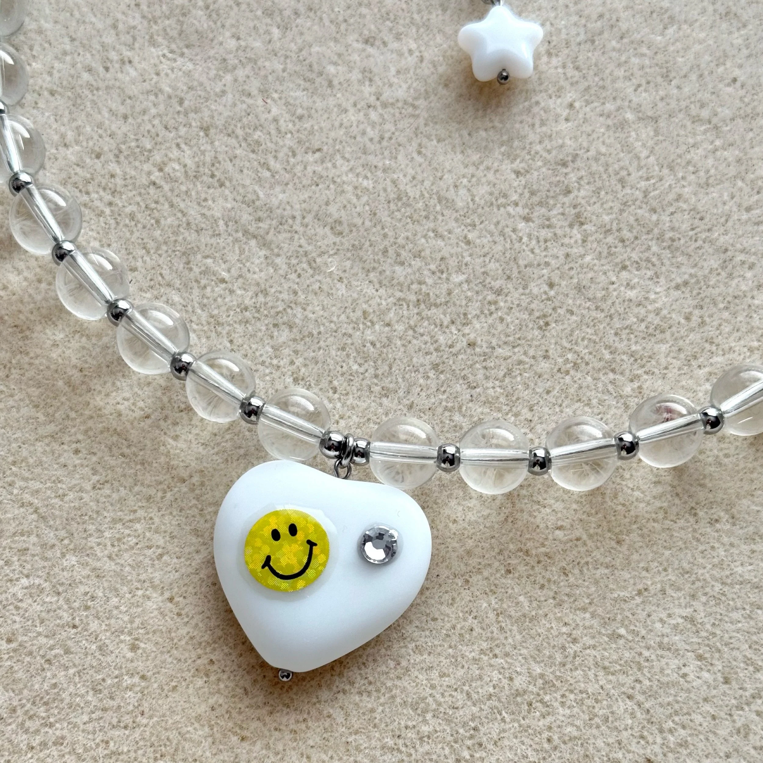made with clear glass beads, stainless steel beads and hardware, a czech glass star bead, and a glass heart pendant with a smiley face sticker and rhinestone sealed to the front in uv resin! all pieces can be delicate so handle with care!