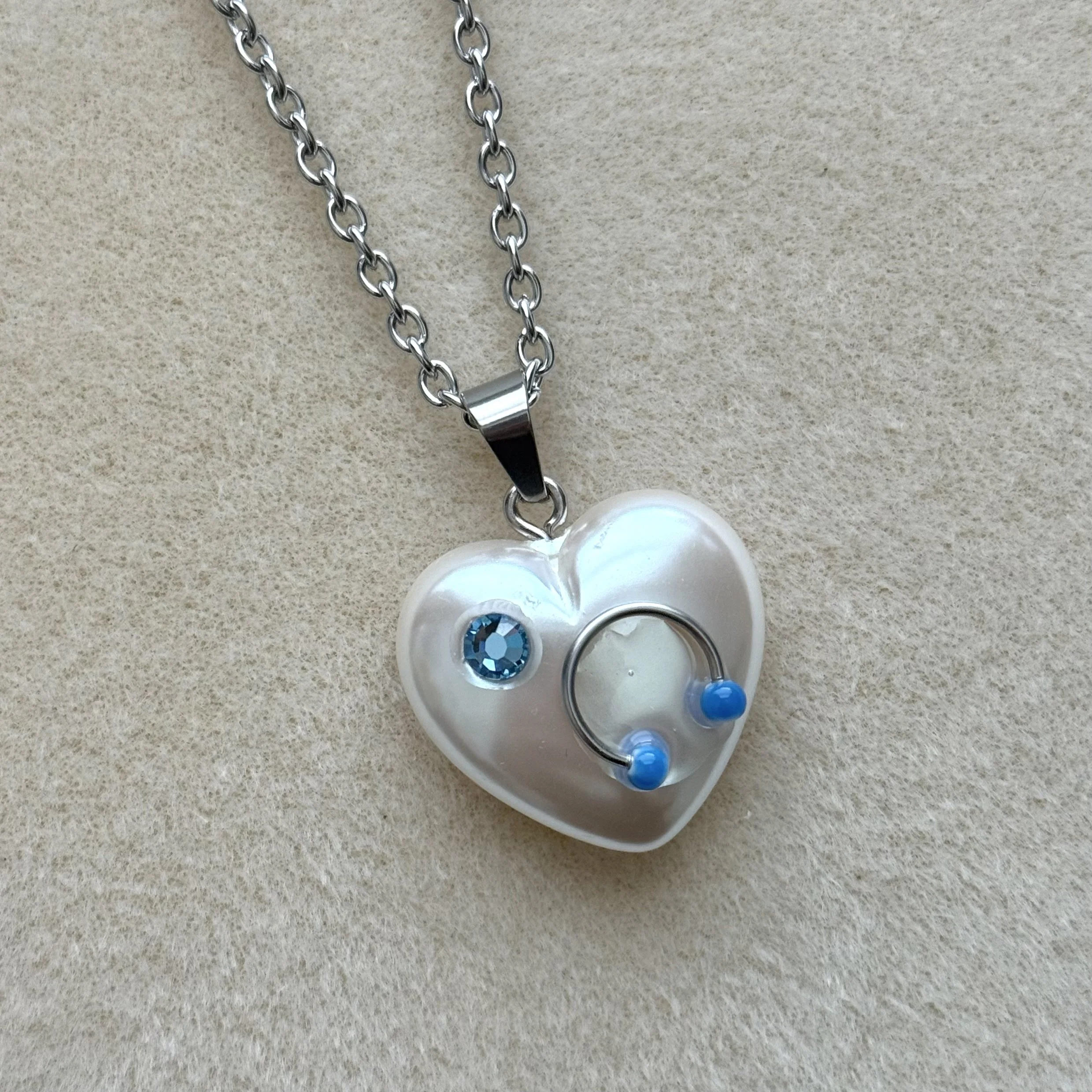 an upcycled faux pearl heart pendant adorned with a horseshoe piercing and crystal rhinestone on stainless steel hardware! all pieces can be delicate so handle with care!