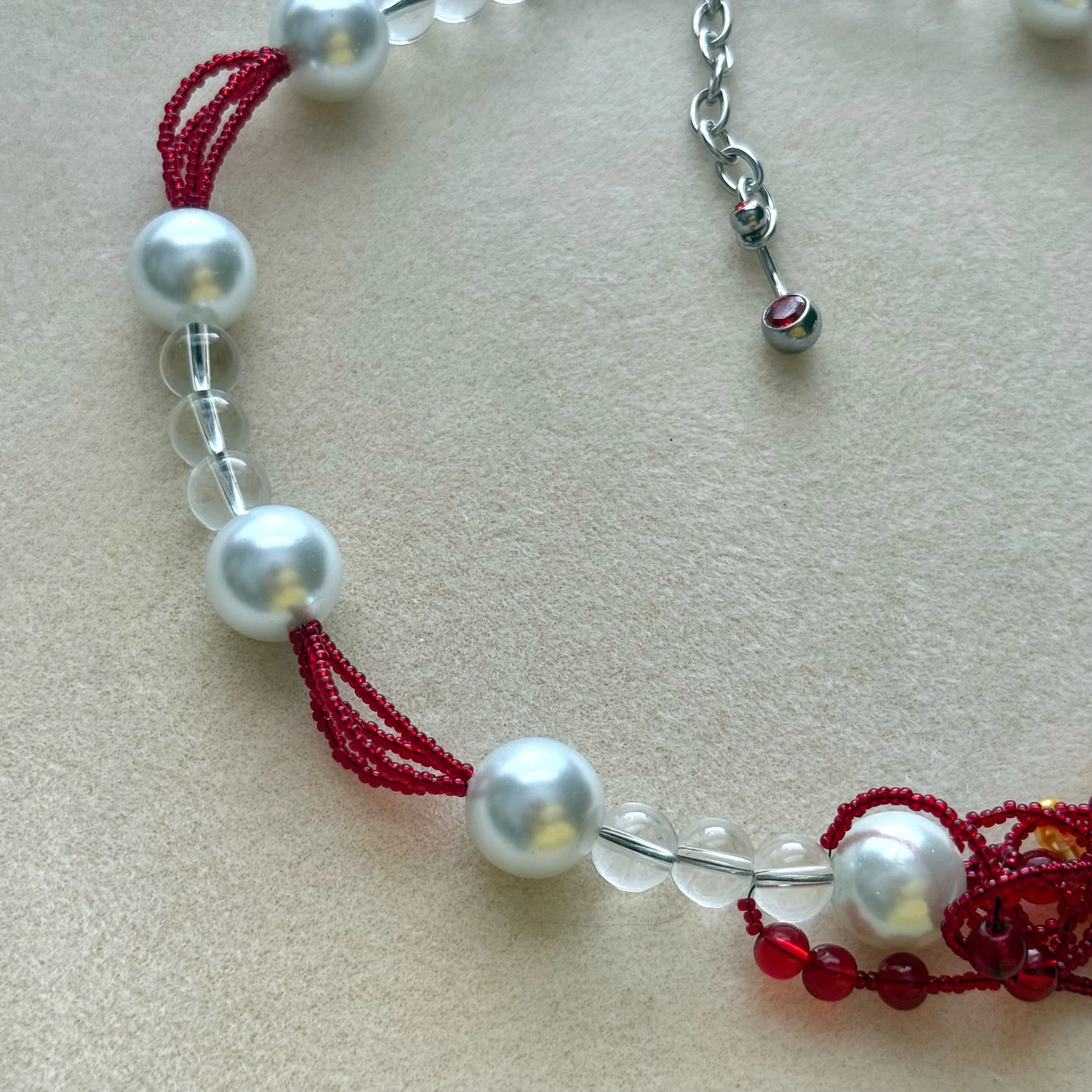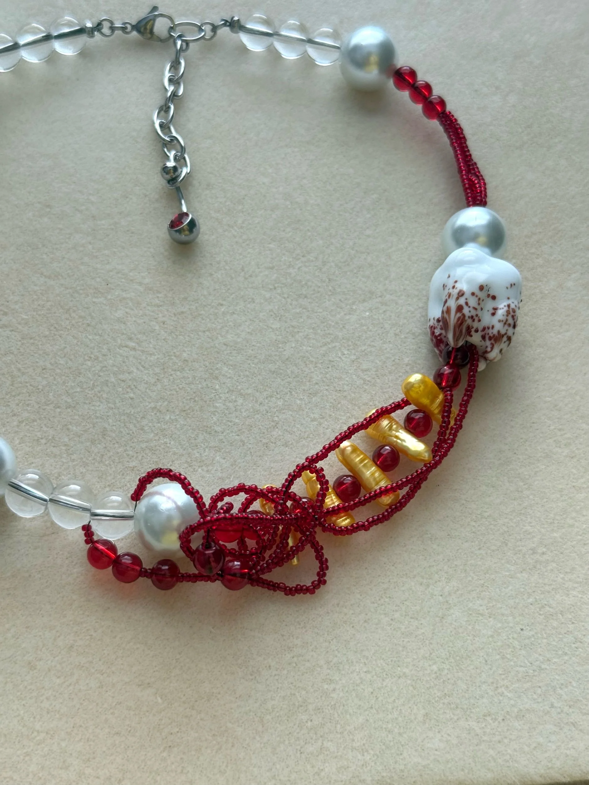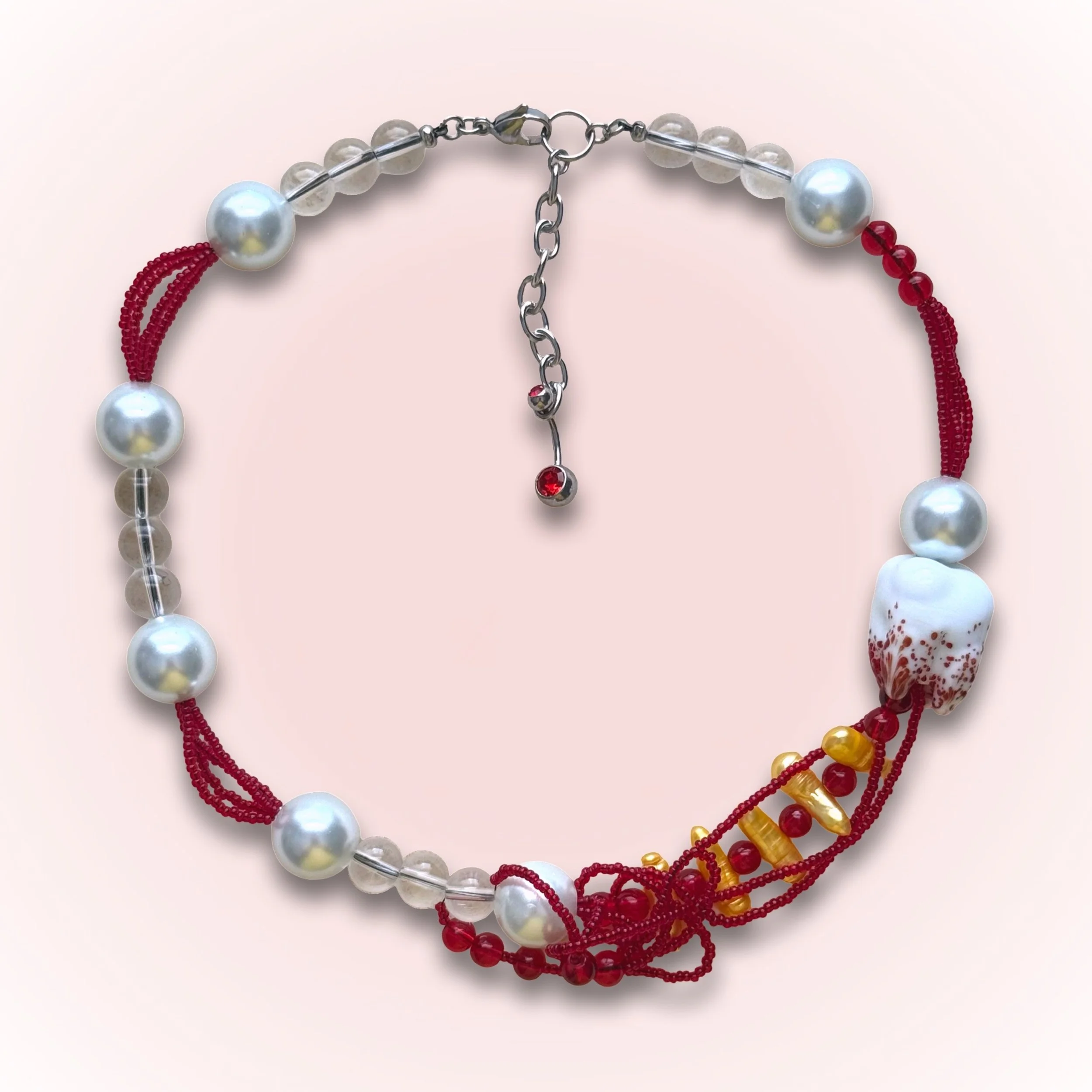 i saw this piece in a dream 7/26/2025 :) made with japanese glass pearls, an artisan lampworked bloody tooth bead, stainless steel hardware, tiny red seed beads, czech glass beads, and yellow dyed freshwater pearls! all pieces can be delicate so handle with care!