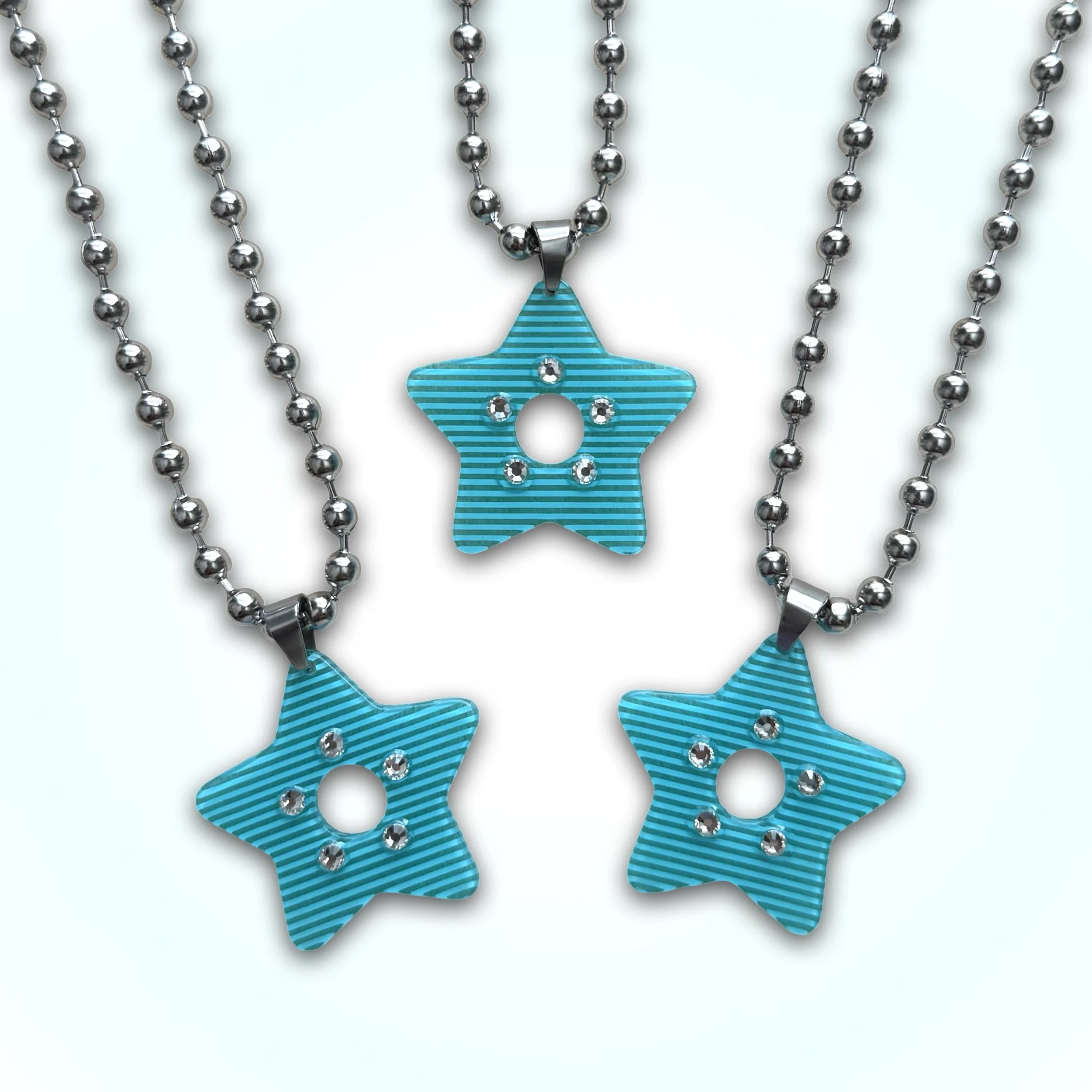 an acrylic striped teal star pendant with uv resin adhered rhinestones on a stainless steel ball chain necklace! all pieces can be delicate so handle with care!